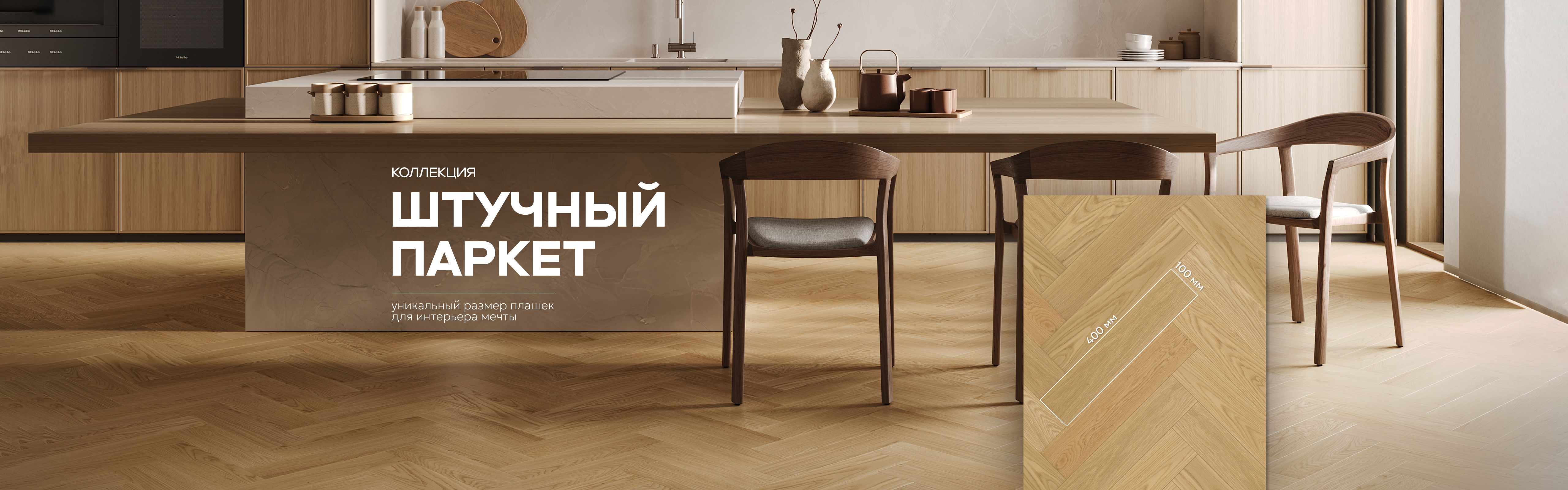 Это новый взгляд на масштаб пространства. Массивные плашки меняют восприятие интерьера: пол выглядит монументально, а каждая доска подчёркивает естественный рисунок дерева.