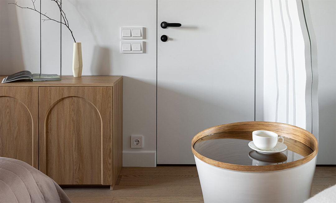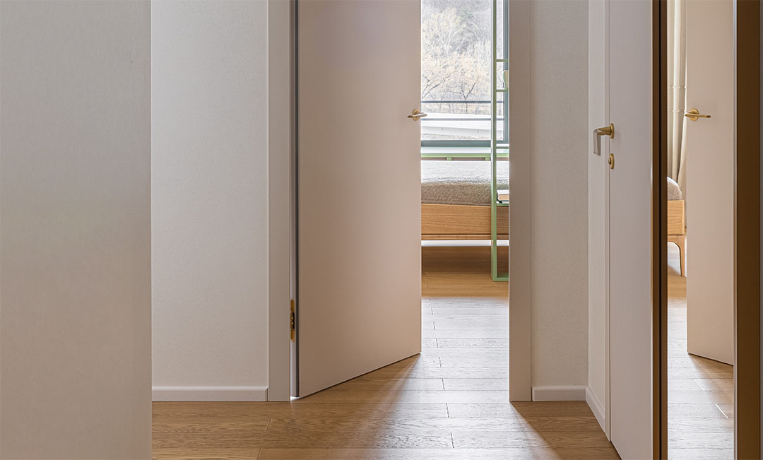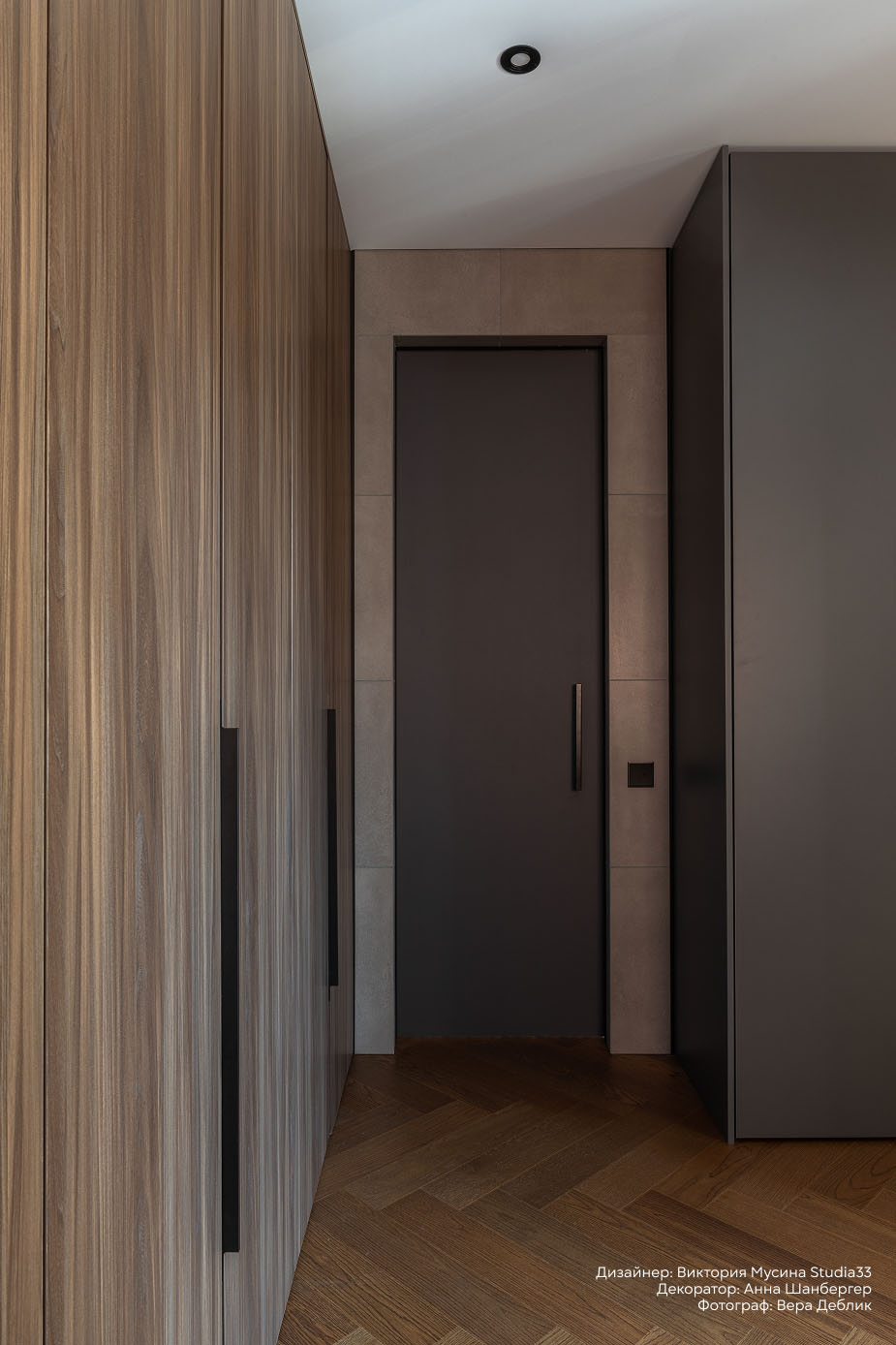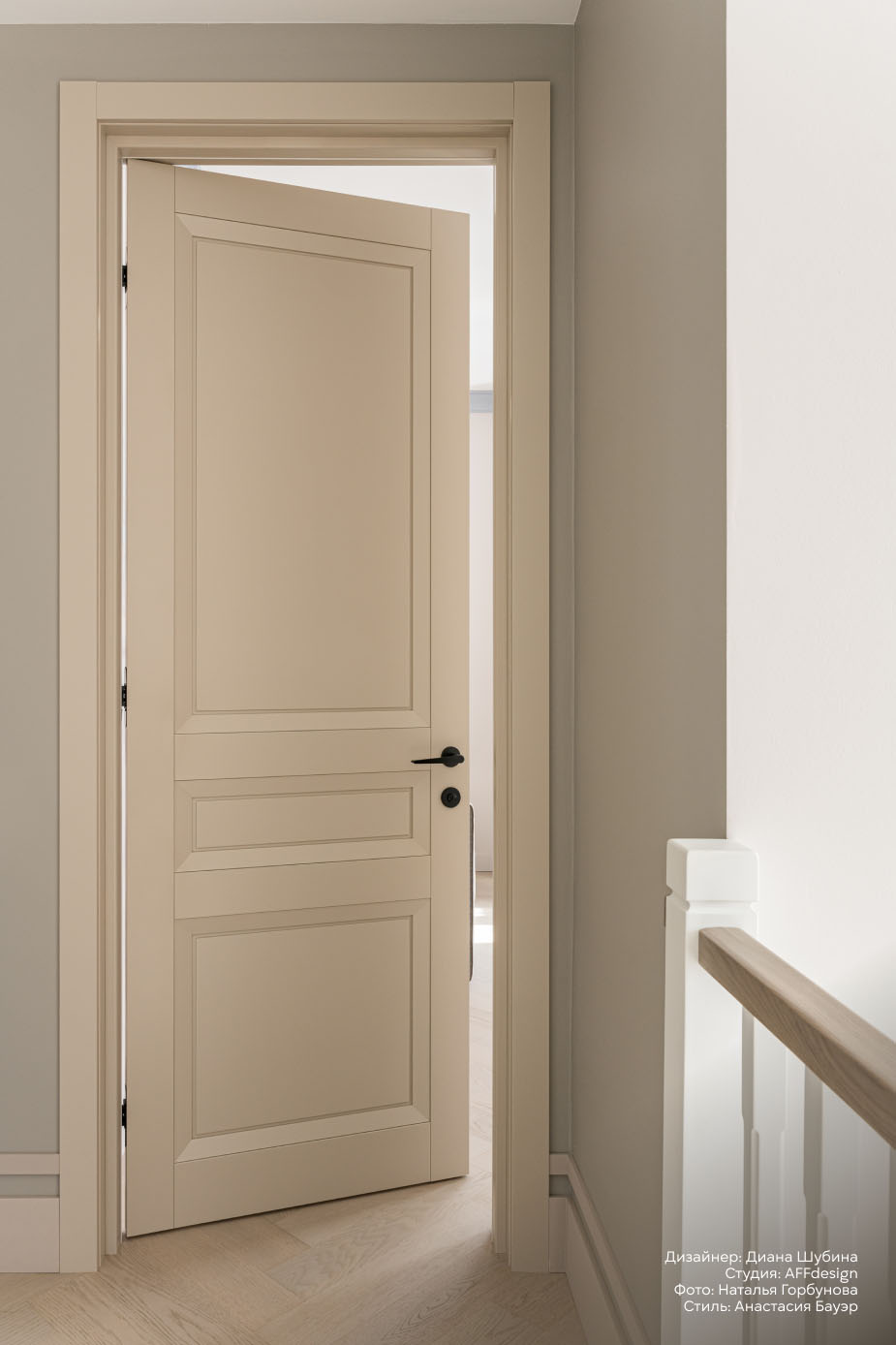 Важно не перегружать интерьер разными породами дерева. Если на полу уже читается дубовый характер, двери лучше делать либо нейтральными, либо очень близкими по температуре.