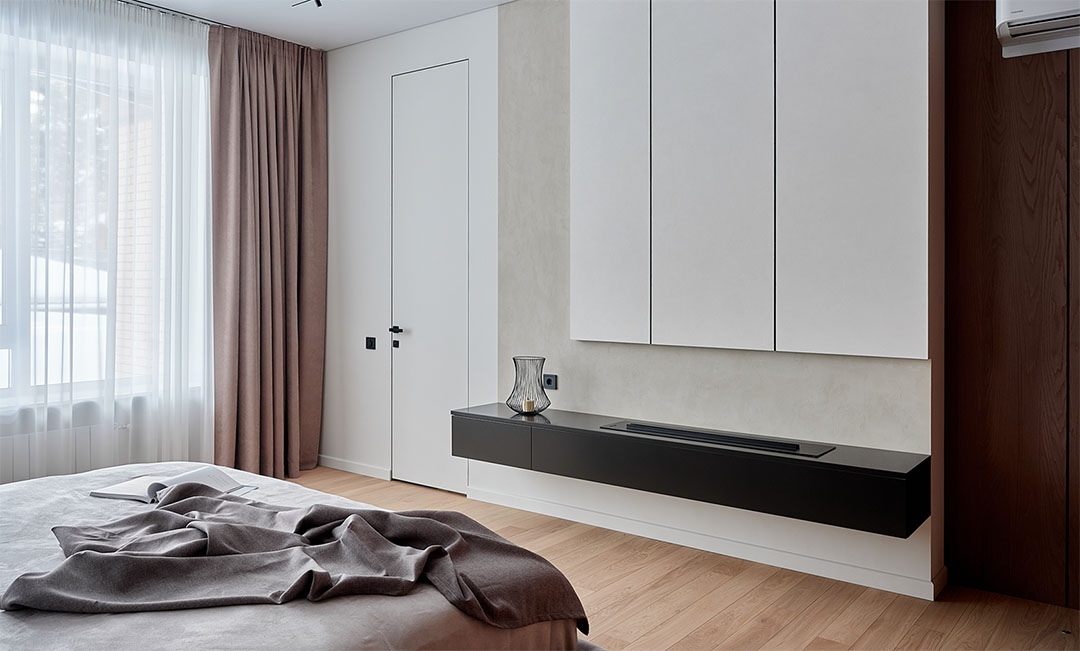 Самое универсальное решение. Оно объединяет вертикали и делает интерьер собранным. Особенно часто используется сочетание белых дверей и белого плинтуса.