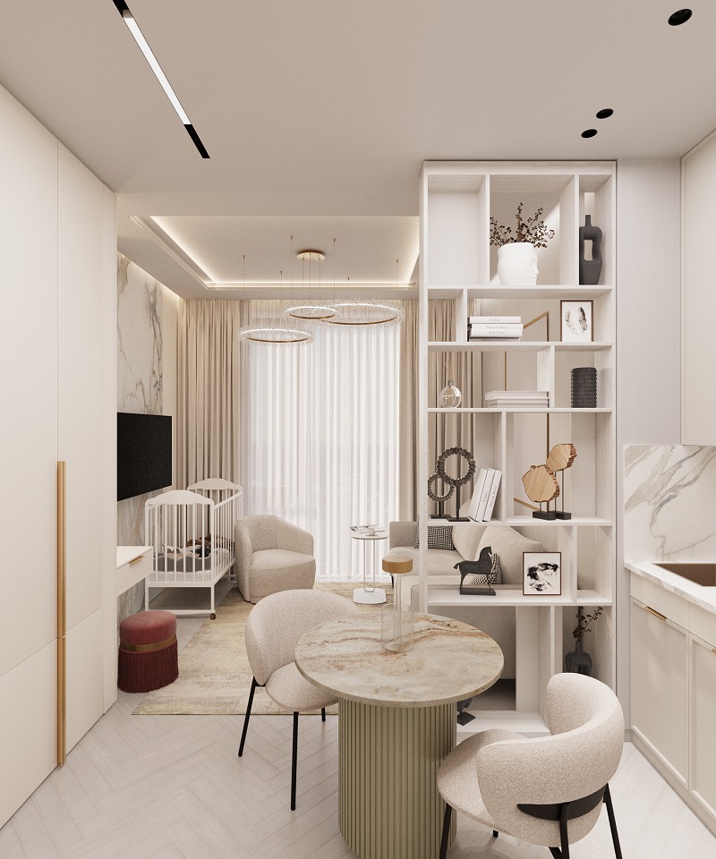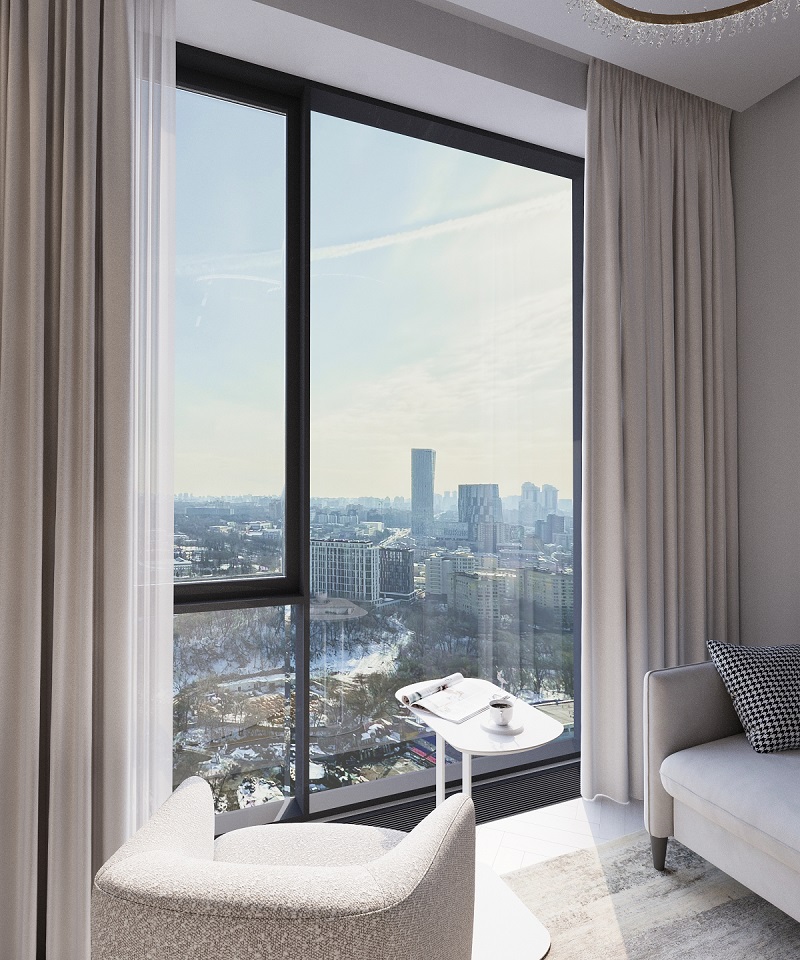 Интерьер в ЖК Will Tower — воплощение легкости и современной элегантности. Обилие белого цвета делает пространство светлым и воздушным, а панорамные окна в пол наполняют его естественным светом в течение всего дня. Натуральные фактуры дополняют атмосферу уюта: на полу — кварцевый паркет в оттенке "Дуб Песочный", который идеально сочетается с благородным мрамором, украшающим отдельные элементы интерьера.