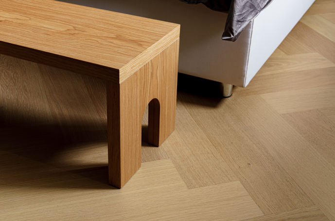 Дизайнер выбрала укладку ёлочкой несмотря на то, что это идёт вразрез с азиатским стилем комнаты. Но такая укладка уже стала классическим вариантом, который подходит почти для любого интерьера.