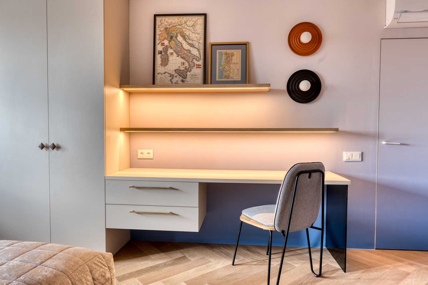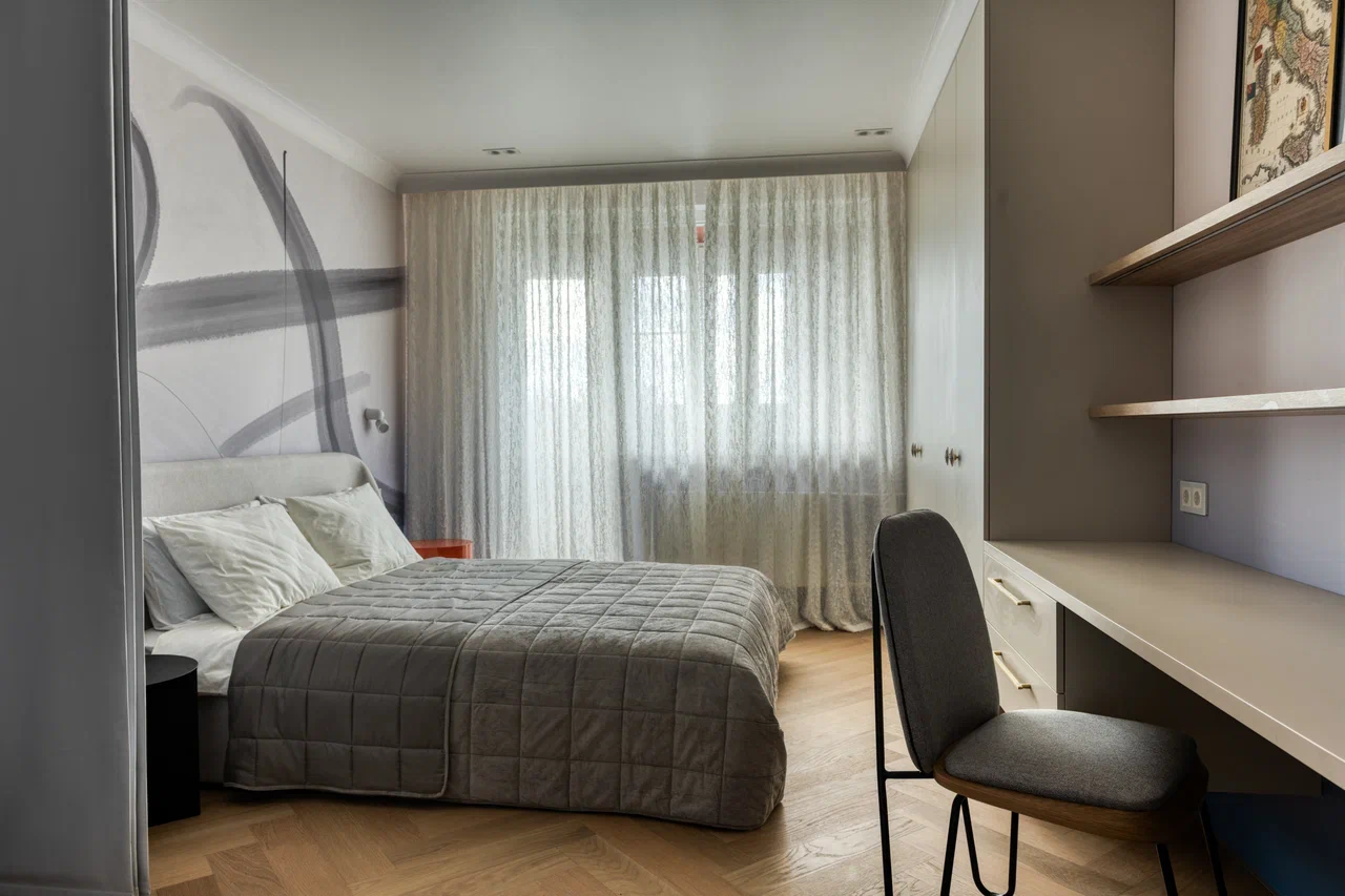 Для реализации проекта спальни дизайнер Марина Кутузова выбрала кварцевый паркет Дуб Лимба. Нейтральное светлое дерево стало идеальной платформой для реализации задумки с чёрными акцентами и контрастной стеной с каллиграфией, вокруг которой и построен весь интерьер.